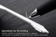 GRIDA is a multi-directional MICRO CHISEL with a mechanical pencil scriber that is practical for panel line scribing from novice to expert. It's specialized for deeper and cleaner re-scribing panel lines. MICRO CHISEL's multi-directional technology is stable when scribing on a flat, curve or irregular shaped surfaces. It can scribe between 0.15mm to 0.20mm lines, and it can scribe up to 0.30mm by scribing multiple times.