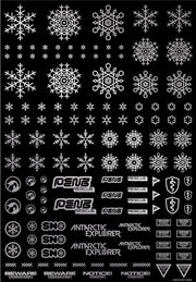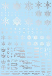 These silkscreened decals allow you to add gleaming silver snowflakes to your favorite model kits! Three different styles of blossoms in several sizes are included, as well as a penguin rescue team logo, medical staff emblems, and somewhat-out-of-the-ordinary "caution" marks ("Notice! Beware of colds") These decals are perfect for aircraft, robots, tanks, snowmobiles and more -- order yours today!