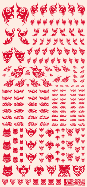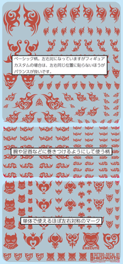 An assortment of red heart-patterned tattoo decals, for water slide application on dolls or figures.