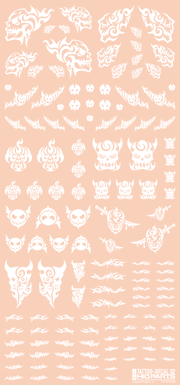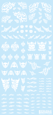 Skull-themed water-slide decals for use as tattoos on your 1/12 scale figures! They come in a range of designs and sizes. This set comes in white.