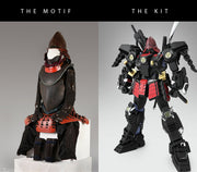• Coloring & Design: The model’s design is inspired by the historic "Nanban Dogusoku" armor, with a newly molded helmet that replicates its iconic look. The black body captures the essence of the original armor, and the body and weapons feature black and chrome plating for a sleek, authentic finish. The red details, such as the grass skirt, are accented with Japanese paper material stickers, while the family crest of the Three-Leaf Chrysanthemum is depicted with a glossy sticker for added realism.