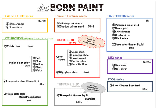 View full detailsCharacteristics High leveling property. Very high solvent resistance. Combined with the Hyper Solid Series, it enhances the coloring of bone mirror...