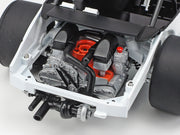 This model kit features slick tires made of solid rubber; the antenna on the roof is made of stainless steel. Decals by Cartograf are included; you can choose car number 1 and 3; the white logo mark and red and blue stripes are vividly reproduced. The hood can be removed after completion, and a driver figure is included, with two types of helmet markings available. The engine and the interior have a three-dimensional finish, too. Order this classic kit for your own collection today!