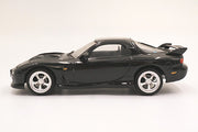Standard curb-side kit of the FD3S RX-7 as it appears in the Initial D anime and manga driven by Kyoko. Body, interior, chassis and details molded in black. Matte chrome rims. Wheels turn and steer after assembly. Note that the headlights cannot open as shown in the box art.