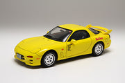 Fujimis RX-7 kit done up for the anime/manga series Initial D. Body and interior molded in yellow. Chassis and details molded in black. Matte chrome rims. Wheels turn after assembly.