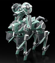 The mecha's four legs and round shield equipped shoulders are all fully articulated.