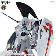The "L.E.D.MIRAGE V3" surprised the entire star cluster. In the ceremony scene in the movie, which was the first public appearance of the V3, it was not equipped with the "Internal Frame unit," the greatest feature of the V3, on its back, so it appeared with a huge counterweight on its head that extended long behind, as well as a ceremonial long spear (lance) in a double bail state with round binder systems on both shoulders that became standard equipment for the V3. The head was also equipped with a long spear (lance) for ceremonial purposes. In this kit, not only the complete reproduction of the white translucent armor, but also these characteristic designs were reconstructed with the latest interpretation from the prototype SAV.