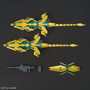 From "Mobile Suit Gundam NT" comes Phenex, with new armour! The gold color of Phenex's armed armor is accurately reproduced through the use of metallic moulded parts - so it'll look splendid right out of the box. Tail-like parts can be attached to the armor, and can be moved at each joint and through the ball joint at their base.