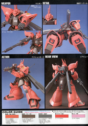 Excellent high-grade kit of the Gelgoog J is molded all in color and features snap-fit assembly; so no paint or glue are required. Polycaps are included for joint movement; the finished product is fairly poseable. Included weapons are the beam machinegun, and 'beam spot gun' (in the forearms).