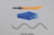 Its signature weaponry includes a shield, a Heat Saber, a Heat Rod, and a Finger Vulcan for its left hand. A regular manipulator left hand is also included to replace the Finger Vulcan if you so desire. Each section of the Heat Rod is ball-jointed so you can bend it into any shape you want! The blade part of the Heat Saber is made of clear orange, and the Mobile Suit's cockpit can slide open to reveal a sitting-pose pilot figure (molded in light blue). Also packed in the set are in-scale figures (molded in light blue) of Ramba Ral and his aide Crowley Hamon. A sheet of stickers and dry-transfer markings are included.