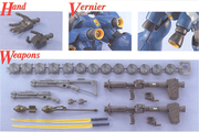 As usual, everything on the kit moves. Fully-posable at all joints; extensive internal detail; individually-posable finger joints; numerous weapons, including the beam saber, 2 Giant Baz bazookas, Sturm Faust with an extra round, shot gun with detachable shoulder stock and the chain mine (ouch!). Most of these mount right on the mechs back or hips for firing and/or storage. Of course, the kit is also molded in color, and features snap assembly.
