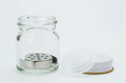 Handy glass bottle with a perforated metal piece in the bottom, for washing your bristle brushes. Extend the life of your paint brushes.