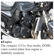 • The compact 1352cc four-stroke, DOHC, water-cooled inline four engine has also been precisely rendered.