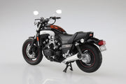 Aoshima brings us the final model of the first generation Vmax! The flared graphic pattern and rim tape of the final model are reproduced with decals. Reproduction of wires, brake hoses, etc. are present here with vinyl pipes and rubber tires are included for added texture.