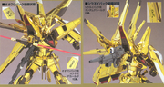 This superb 1/100-scale kit of the Akatsuki Gundam with its gleaming golden parts is irresistible to those who love mechs in shining armor! Akatsuki Gundam comes with two optional packs, which include the Oowashi and Shiranui pack, that can be attached to its back. Armaments include a beam rifle, shield, and two beam sabers that can be connected to form its signature double-bladed beam saber. A display base is included along with custom decals for detailing up your completed kit.