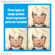 Sestieh is the newest member of Bandai's "30MS (30 Minutes Sisters)" figure-kit series! The parts on the runners are arranged with consideration given to ease of assembly and work flow, so putting the kit together will be a breeze! A headband part is included, and her three interchangeable face parts -- normal, surprised, and smiling -- are printed using tampo printing. The hip joints on the abdomen have a mechanism to prevent them from coming off when moving the legs during posing; the large knife has a folding mechanism in the grip. Many ring-type joint parts that can be attached to her arms and legs are included. Create your own sister by combining her with previously released "30MS" face parts, hairstyle parts, and body parts! This figure uses the same 3mm joints as other items in the "30 Minutes" series, so you can use parts from "30 Minutes Missions" items too. Place your order today!