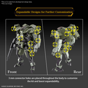 The North American Alliance Army's latest mass-produced machine, the Aaron Rhino, from "Kyoukai Senki" is now a High Grade model kit from Bandai! With an emphasis on expandability, 3mm-diameter connection holes are placed in various places to allow customization. If you combine it with the weapon set series (sold separately), you can create your own custom model! It's equipped with a variety of weapons, such as a knife, assault rifle, and chain gun. A knife can be mounted under the armpit, and both "battle mode" and "enemy search mode" can be reproduced with parts replacement. Combine it with the HG V-33 Stalk Carry to display it in transport mode! Order yours today!