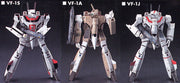 Hasegawa releases the first-ever robot kit in the history of their firm with this posable (but not transforming) version of the VF-1 Valkyrie from Macross. Poly-caps used for smooth joint action. Kit comes with heads and decals to allow you to build it as either the black/yellow or black/red S, the red J, or the brown, mass-production version A. Some cement necessary, but it's primarily snap-fit. Painting required to get a finish like that seen here, but decals alone will do a reasonable job for the S or J, if you're not too picky. Comes with parts to mount the gun on the Battroid's arm. Multiple, interchangable hands included for recreating various poses.
