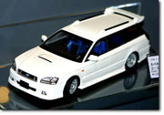 Very nice curbside kit of the Legacy Touring Wagon 'B' version, with BBS-made wheels. Body is molded in white plastic, the chassis in black, and clear parts are included for windows; chrome-plated parts are included for detail. Decals for exterior markings, license plates (build-your-own plates include 'blank' Shinagawa plates -- you apply the engine capacity and the license number to your own liking), and interior dashboard panels. Please note that some details in the completed kit are not identical to those in the photo on the top of the box.