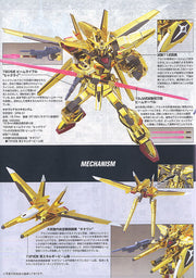 Beautiful gold-plated "Oowashi Akatsuki" Gundam for you to put together snaps all together and requires no paint or glue; dry transfer decals and foil stickers for markings are included. Polycaps assist with the building and ensure that the joints of the finished model are movable, for a poseable, beautiful machine when you're done. Naturally the Akatsuki beam sabres, a beam rifle, and "Oowashi" backpack are included for armament.