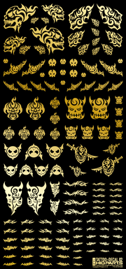 Skull-themed water-slide decals for use as tattoos on your 1/12 scale figures! They come in a range of designs and sizes. This set comes in gold.