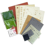 Includes laser sheets A-H (8 sheets), printed sheet (1 sheet), plastic plate (1 sheet), base (1 sheet), ground (sponge, powder), colored sand, and assembly instructions.