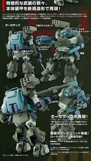The "Scope Dog Turbo Custom" is equipped with a new armament, featuring a Gatling gun and a turbo sack that can be connected to a seven-missile pod. Newly molded parts are used to thoroughly recreate impressive weapons such as a multi-discharger, twin missile launcher, arm gun, and hand rocket launcher, as well as the details of the magazine.