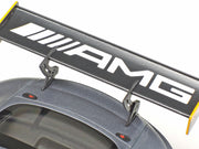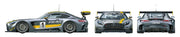 This 1/24 scale plastic model assembly kit captures the glamorous long nose, short deck form of the AMG GT3. Stunning details include bonnet and fender air outlets and use of mesh to depict grille sections. You will find realistic, multi-part depictions of interior (including seat, roll cage, door interior panels) and suspension. Metal-plated parts recreate the front grille while an integrated emblem and decals are included to recreate the dash display. Markings for the gun metal and yellow Mercedes-AMG livery used when the car was tested, displayed at shows, etc. is also included.