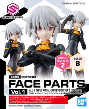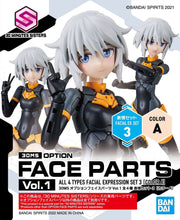 Change your 30MS (30 Minutes Sisters) figure model kit's face and personality with this face parts set! There are four different sets available, and each set contains three different facial expressions (for a total of 12 expressions).The features are tampo printed. Order yours today!